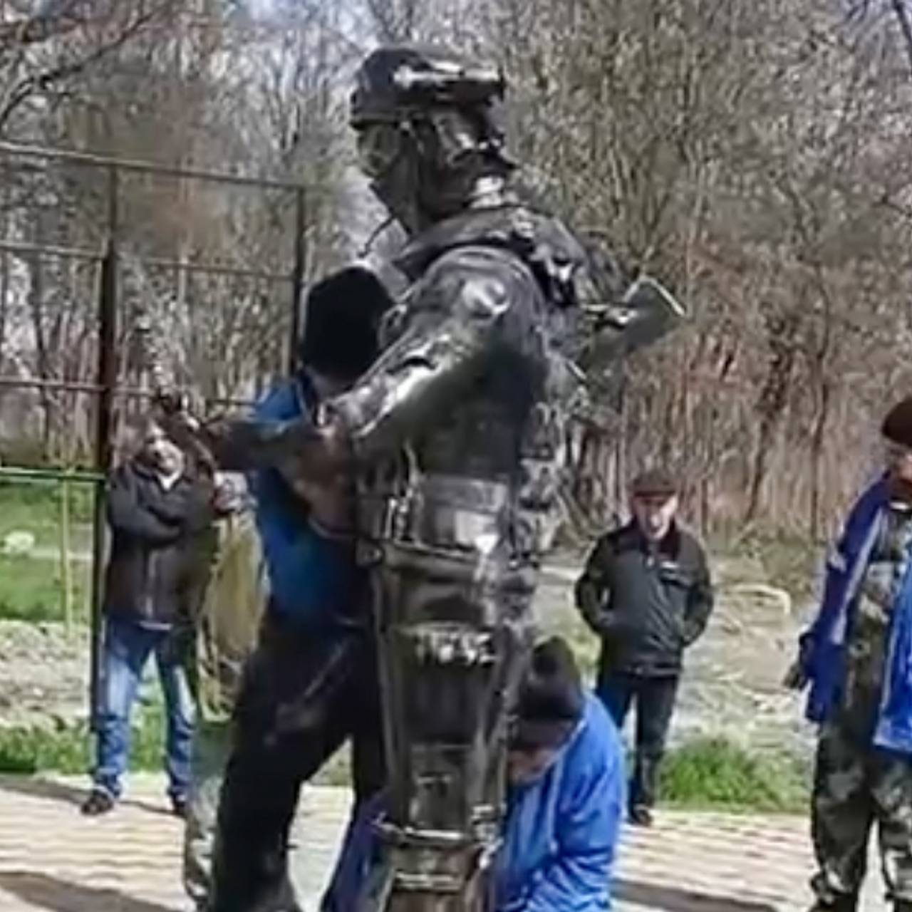Снос памятника сняли на видео. «Эта форма не наша вот эта вот впереди, это не разгрузка, автомат не наш, вообще наш экземпляр автомата — это Калашникова, наша фишка! Это уродство, натуральное уродство! Слава Богу, что убирают», — возмущенно отметила свидетельница демонтажа памятника.