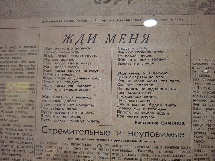 В отделе литературного музея на Зубовском бульваре в эти дни открылась выставка "...И я вернусь", заслуживающая детального осмысления и описания. Но в первую очередь сообщим, что на ней представили газетную версию культового фронтового стихотворения. "Жди меня" переписывали в годы ВОВ от руки, начиная с осени 41-го, цитировали в письмах с фронта и на фронт. Но у реки всенародного почитания бесценного текста есть печатный исток - публикация в номере "Правды" от 15 января 1942 года.