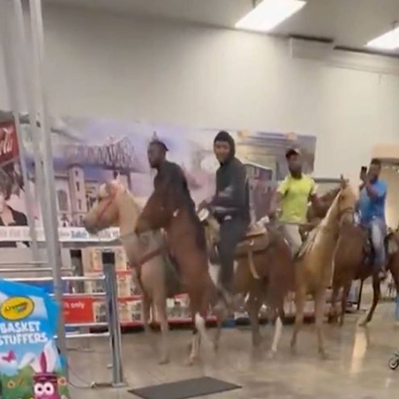 Четыре ковбоя на лошадях ворвались в супермаркет и попали на видео